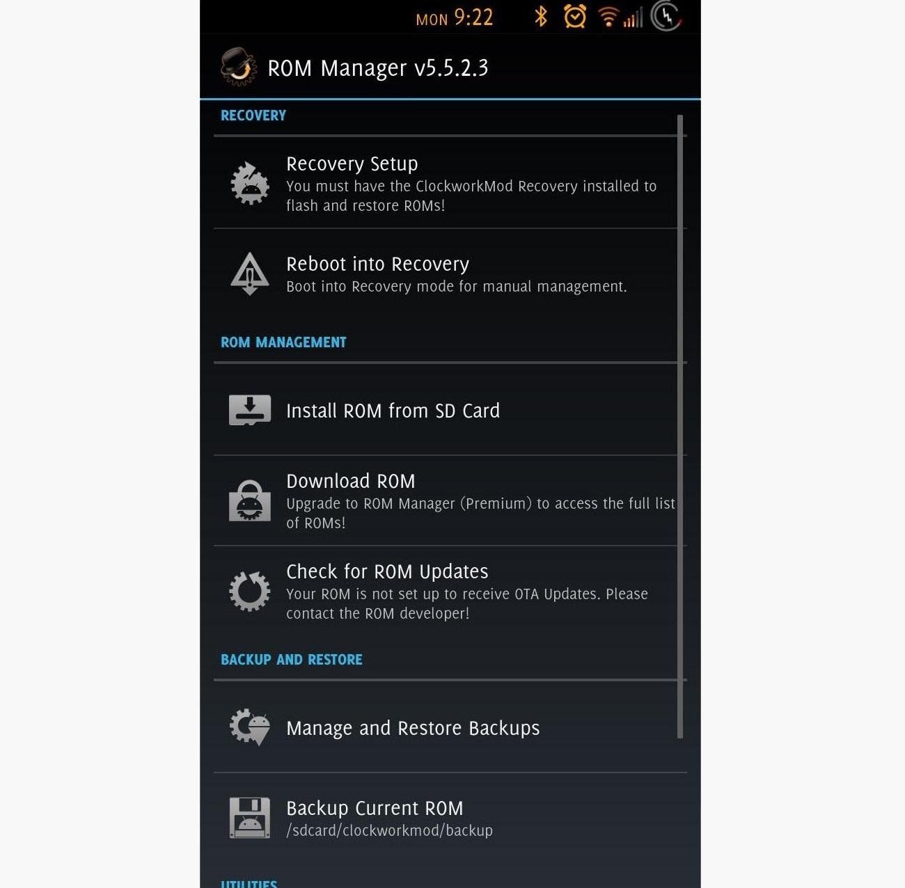 Sekarang perangkat Anda sudah di-rooting, tetapi Anda ingin menginstal pemulihan khusus untuk mengganti yang stok. Ini akan memungkinkan Anda untuk mem-flash ROM kustom, membuat cadangan sistem lengkap dengan mudah ( nandroid ), mempartisi kartu SD Anda, dan banyak lagi.